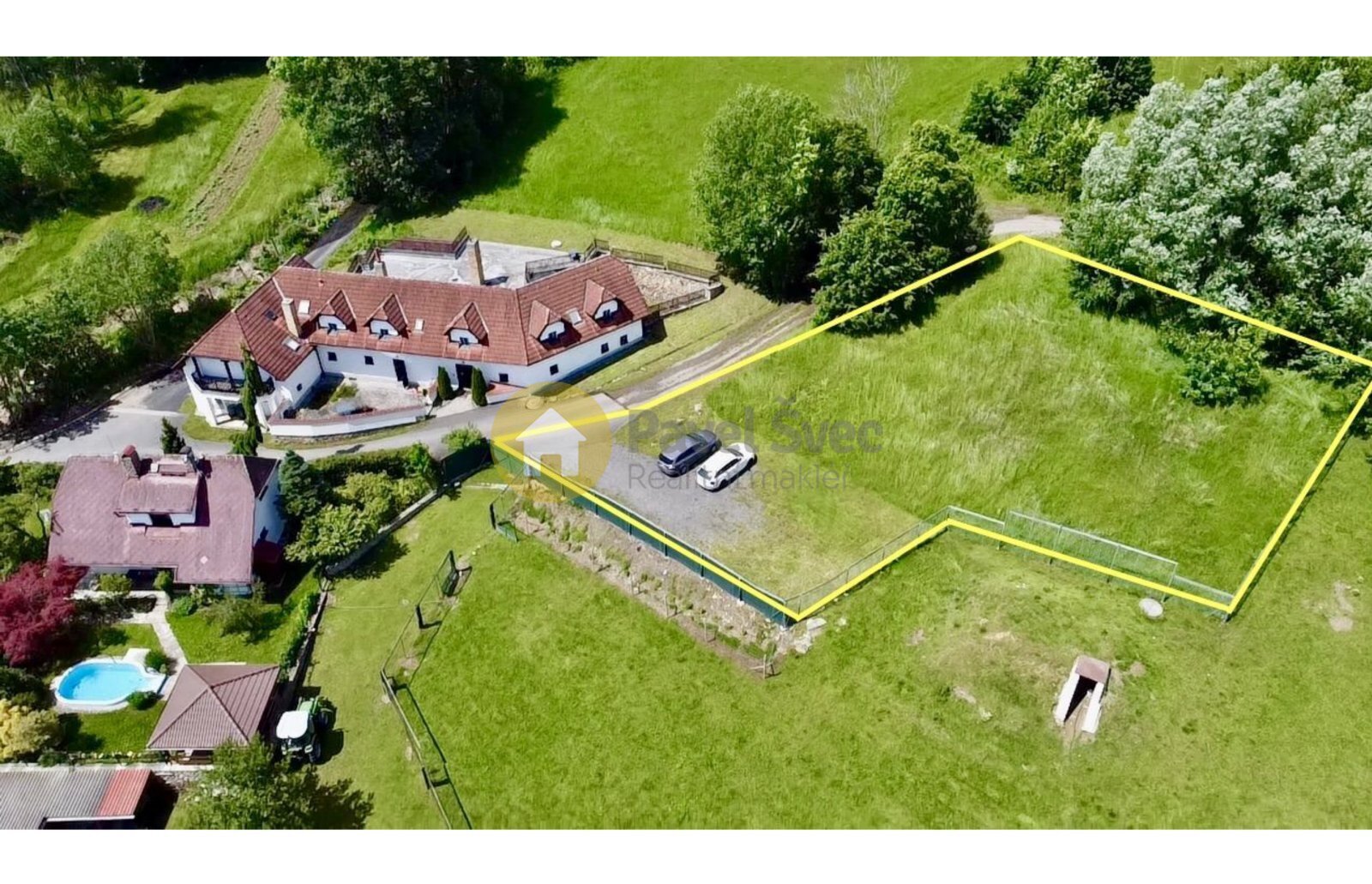 Bezproblémový přístup po asfaltové silnici na pozemku obce.