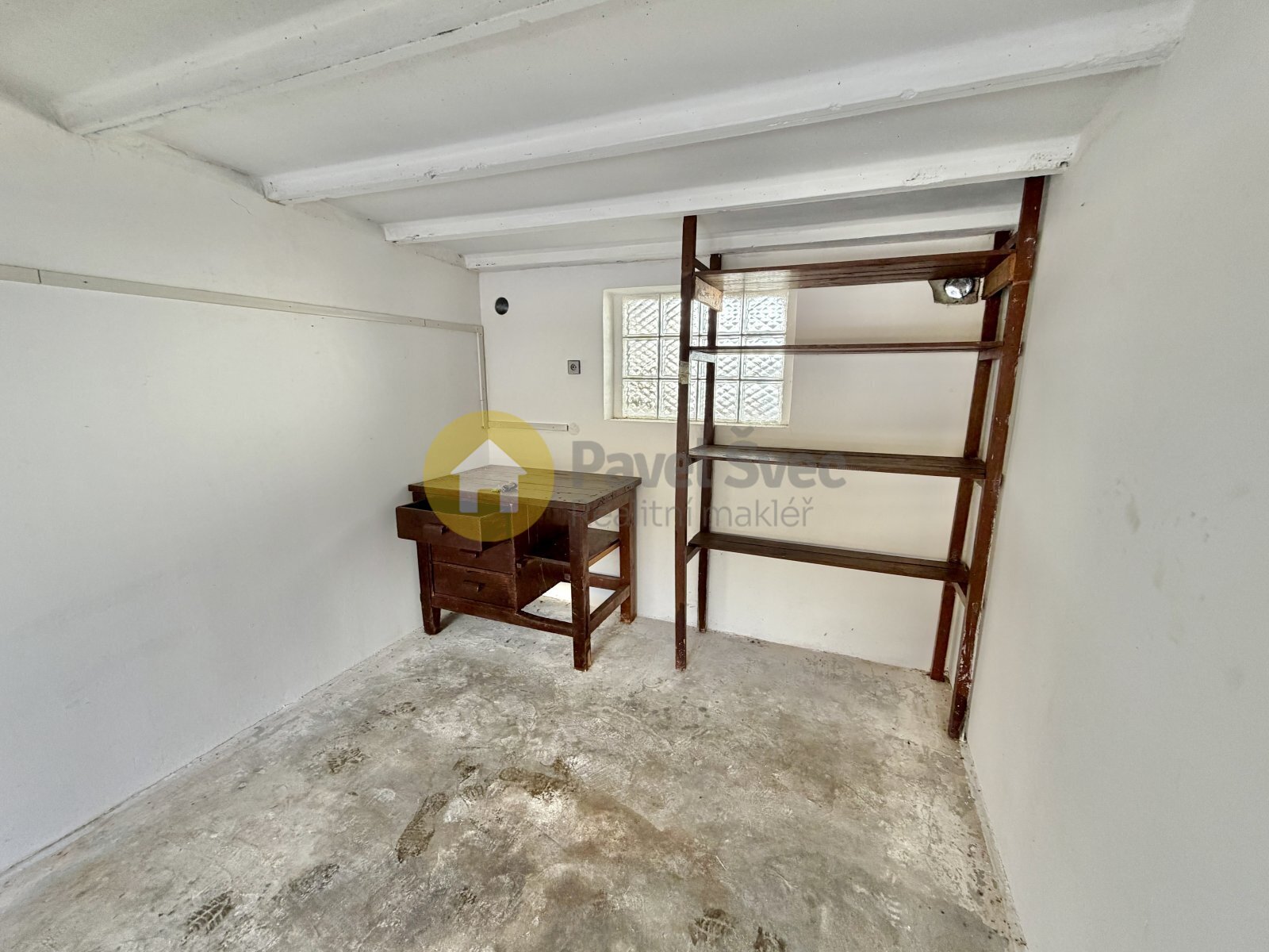 Velmi pěkný a udržovaný prostor se zavedenou elektřinou (světlo, zásuvka), s úložnými policemi, menším stolkem, regálem, vhodný ke skladování či drobnému kutilství.